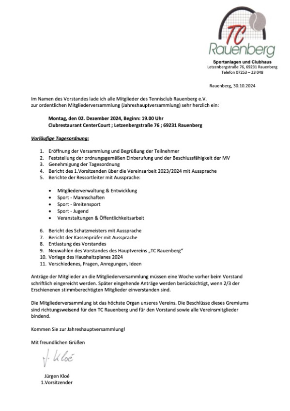 ab 19.00 Uhr die Mitgliederversammlung des TC Rauenberg e.V.