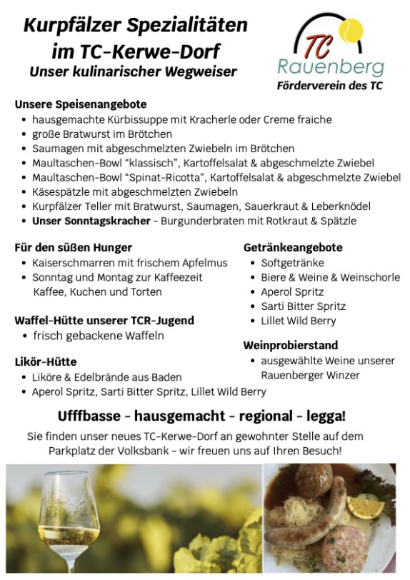 Unser Angebot reicht von allerlei Kurpfälzer Spezialitäten -klasssich&vegetarisch-, über ausgewählte Weine unserer Rauenberger Winzer an unserem Weinprobierstand & Cocktails bis hin zu Liköre&Edelbrände, Kaffe&Kuchen (Sonntag&Montag)