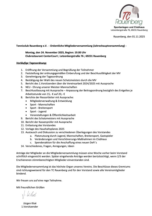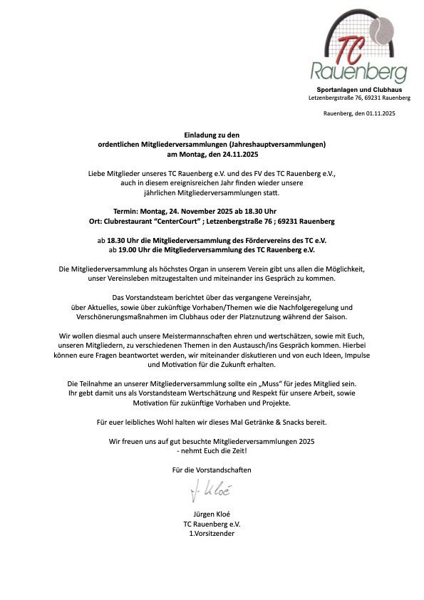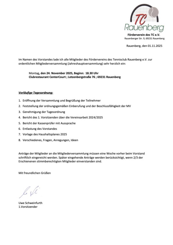 ab 19.00 Uhr die Mitgliederversammlung des TC Rauenberg e.V.